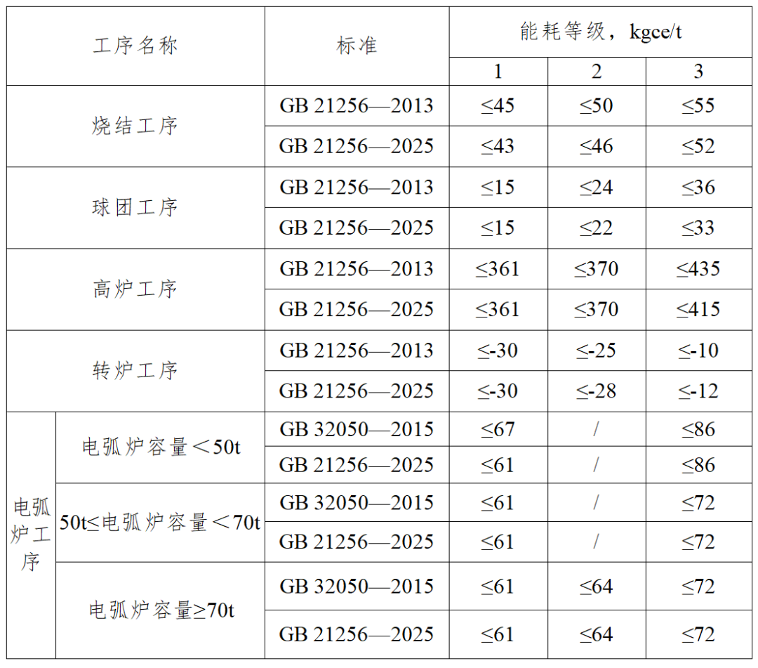 根據(jù)對(duì)粗鋼生產(chǎn)主要工序單位產(chǎn)品能耗等級(jí)的規(guī)定,2025版各等級(jí)能耗取值原則為: