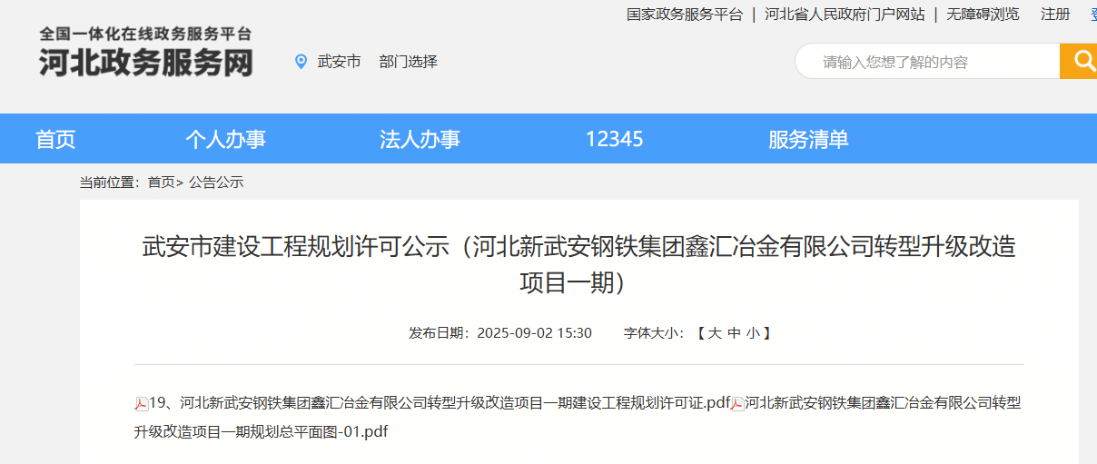 據(jù)河北省政務(wù)服務(wù)網(wǎng)消息,近日,武安市建設(shè)工程規(guī)劃許可公示(河北新武安鋼鐵集團(tuán)鑫匯冶金有限公司轉(zhuǎn)型升級(jí)改造項(xiàng)目一期)。