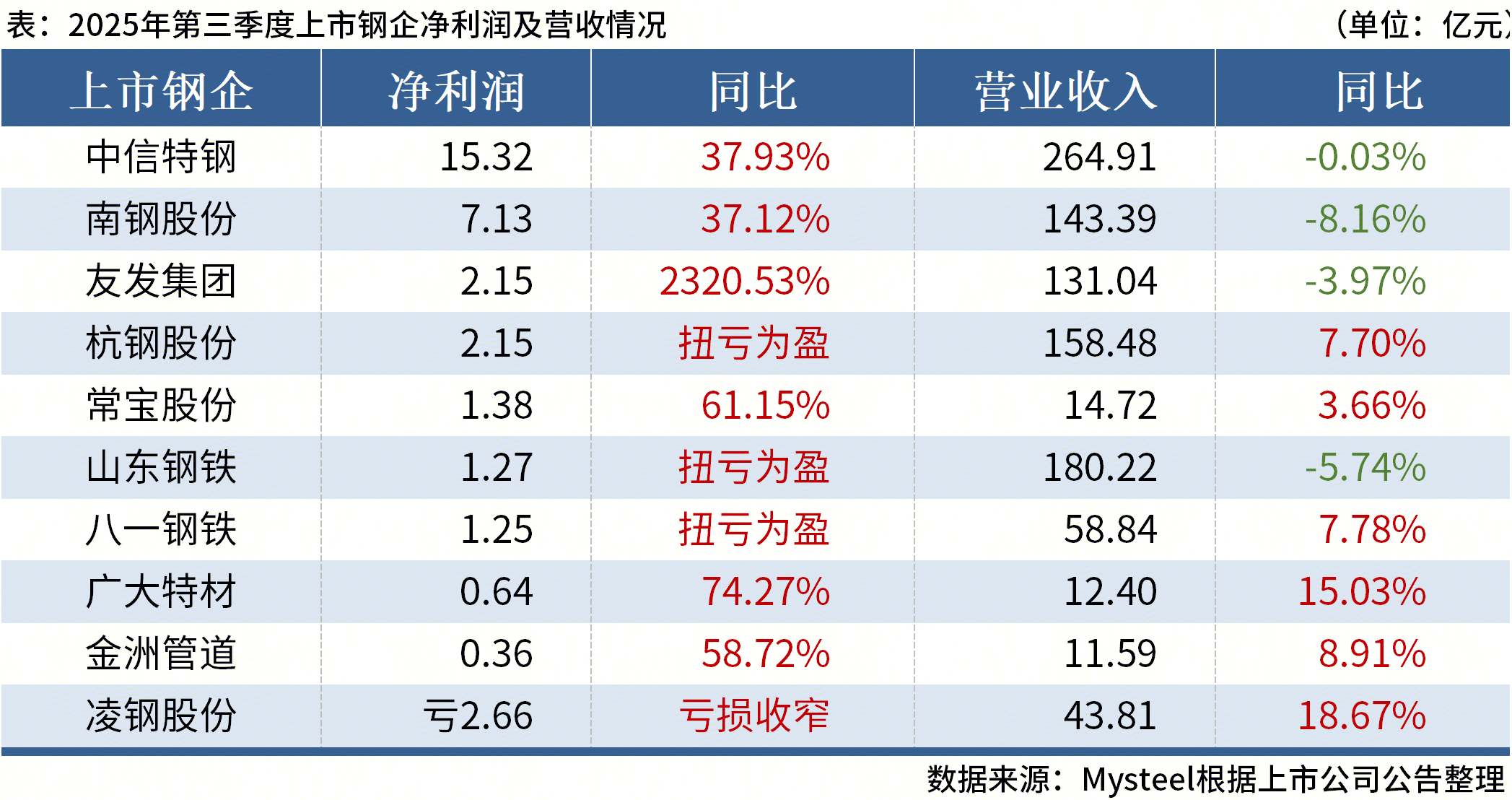 10家上市鋼企2025年前三季度合計營業(yè)收入300.47億元。