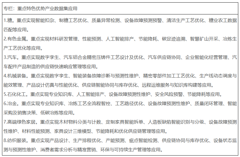 聚焦糖、有色金屬、汽車、機械裝備、石化化工、冶金、高端綠色家居、紡織服裝等廣西重點特色優(yōu)勢產(chǎn)業(yè),鼓勵其他產(chǎn)業(yè)積極探索,堅持場景需求和問題導向,梳理數(shù)據(jù)集應用需求。