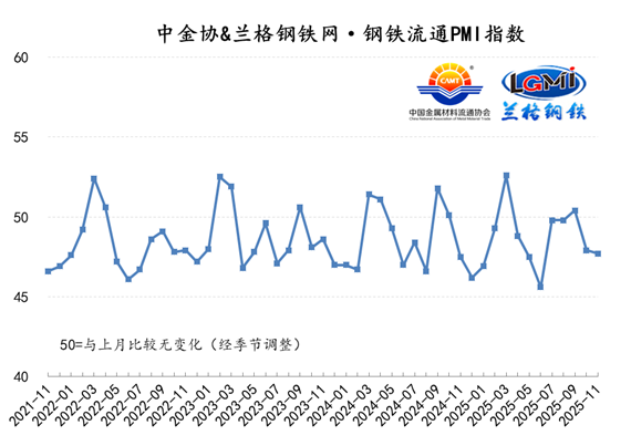 2025年11月份,中金協(xié)&蘭格鋼鐵網(wǎng)·鋼鐵流通PMI指數(shù)在收縮區(qū)間內繼續(xù)下降,表明國內鋼材市場進入了傳統(tǒng)的需求淡季,下游終端需求的釋放呈現(xiàn)明顯的分化,建筑用鋼需求受到了明顯的季節(jié)性施工淡季的影響,而制造用鋼需求保持了明顯的釋放韌性,同時國內鋼市的運行邏輯也向“淡季看預期”轉變,進入12月份,美聯(lián)儲的降息預期以及年度經(jīng)濟工作會議的政策預期再次成為市場關注的焦點,因此預計12月份國內鋼材市場或將呈現(xiàn)低位震蕩的局面。