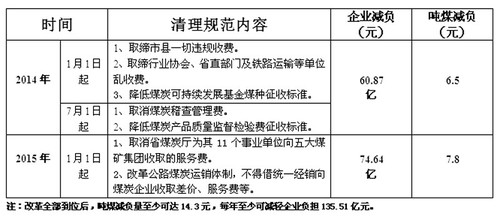 通過(guò)清理規(guī)范,2014年我省至少可減輕煤炭企業(yè)負(fù)擔(dān)60.87億元,噸煤減負(fù)6.5元;2015年可再減輕煤炭企業(yè)負(fù)擔(dān)74.64億元,噸煤再減負(fù)7.8元。兩步改革全部到位后,噸煤減負(fù)量至少可達(dá)14.3元,每年至少可減輕企業(yè)負(fù)擔(dān)135.51億元。