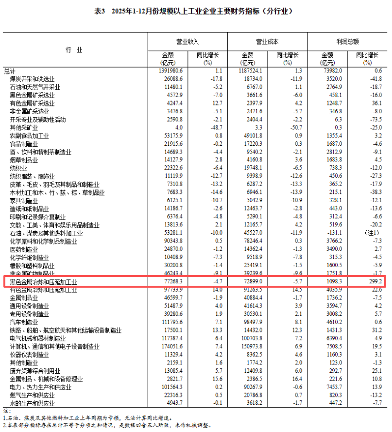 2025年,黑色金屬冶煉和壓延加工業(yè)實(shí)現(xiàn)利潤(rùn)總額1098.3億元,同比增長(zhǎng)299.2%。