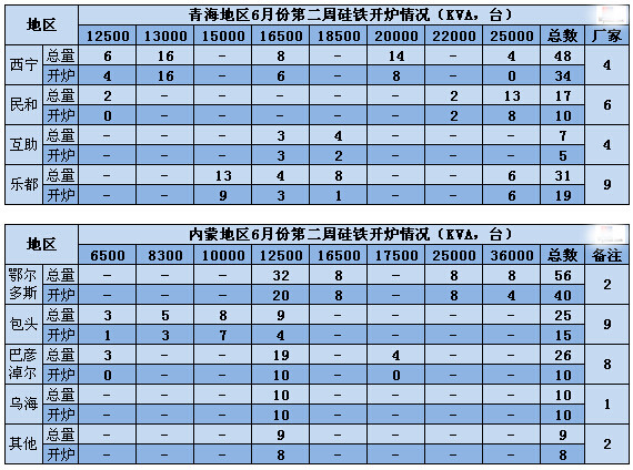 Mysteel調(diào)查青海、內(nèi)蒙地區(qū)本周硅鐵開爐情況,共取樣40余家中大型硅鐵生產(chǎn)企業(yè),總計229臺硅鐵礦熱爐,投產(chǎn)165臺,開工率在65%。其中,青海地區(qū)共計103臺礦熱爐,投產(chǎn)72臺,開工率在64%,內(nèi)蒙共計126臺礦熱爐,投產(chǎn)89臺,開工率66%。