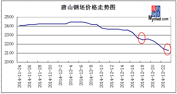 上圖是近1個月以來的唐山鋼坯價格走勢圖。從上圖可以看出唐山鋼坯價格從12月7日開始了下跌之旅,16日價格開始加速下滑,一直持續(xù)到18日,但18日下滑幅度有所止住,19日價格便打破下跌格局小幅上揚,見上圖第一個紅色圓圈處。接下來從21日起,鋼坯價格繼續(xù)加速下滑,一直持續(xù)到今日,但是今日下滑幅度有所減緩,就如18日一般,見上圖第二個紅色圓圈處。筆者認(rèn)為,這是一個止跌的信號,并且往往暴跌之后必有反彈,19日第一波反彈失敗,那么接下來的反彈成功率應(yīng)該是增大的。從這點來看,鋼坯價格或許能緩住一口氣。
