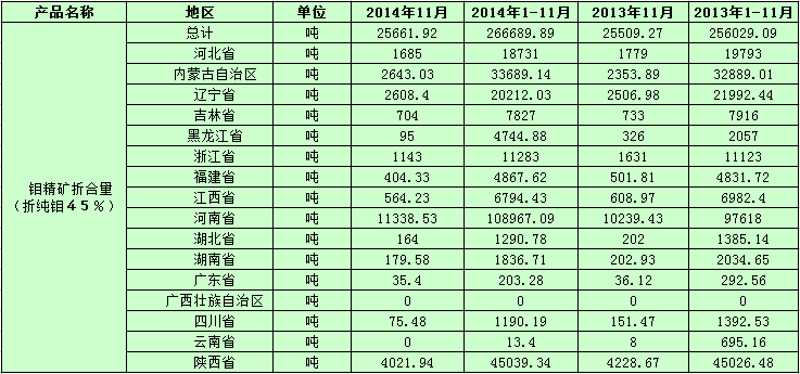 據數據顯示:2014年11月份國內鉬精礦總產量25661.92噸(折純鉬45%),較去年11月份總產量25509.27噸,同比增長0.6%;較今年10月份總產量25730.98噸,環(huán)比減少0.3%;2014年1-11月累計生產鉬精礦總產量266689.89噸,較去年1-11月總產量256029.09噸,同比增長4.2%。