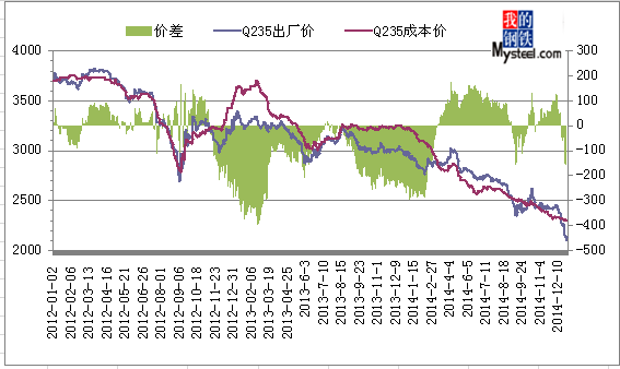 截至12月26日唐山地區(qū)鋼坯測(cè)算成本價(jià)為2292元/噸,出廠價(jià)為2100元/噸。出廠價(jià)格與測(cè)算成本之間差價(jià)-192元,近期鐵礦石價(jià)格下跌,鋼坯出廠價(jià)跌幅較大,唐山鋼坯盈利空間處于負(fù)值,基本處于倒掛生產(chǎn)中。