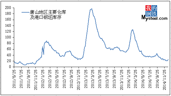 12月25日唐山主要倉(cāng)庫(kù)及港口同口徑統(tǒng)計(jì)鋼坯庫(kù)存25.8萬(wàn)噸。較上周(12月18日)上升4.3萬(wàn)噸。多數(shù)倉(cāng)儲(chǔ)因?yàn)殇撆鲀r(jià)格的大幅下跌而有所入庫(kù),部分倉(cāng)儲(chǔ)持穩(wěn),部分倉(cāng)儲(chǔ)后續(xù)有少量的入庫(kù)計(jì)劃。