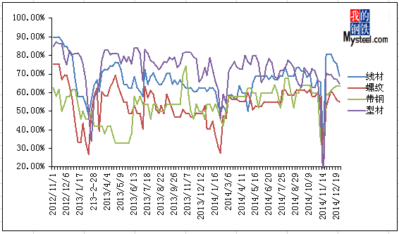 唐山鋼坯價(jià)格接連下跌,鋼廠出貨量減少,廠內(nèi)庫(kù)存壓力較大,本周唐山地區(qū)型鋼廠檢修較上周增加,產(chǎn)能利用率較上周繼續(xù)下降,本周唐山地區(qū)型材產(chǎn)能利率利在64.88%,較上周下降2.35%。據(jù)不完全統(tǒng)計(jì),本周(12.20日-12.26日)唐山地區(qū)63條型鋼生產(chǎn)線,其中32條產(chǎn)線正常生產(chǎn),31條檢修,累計(jì)影響產(chǎn)量為22萬(wàn)噸,產(chǎn)能利用率為64.88%,較上周下降2.35%。其中角鋼12條檢修,累計(jì)影響產(chǎn)8.06萬(wàn)噸,產(chǎn)能利用率為50.15%,槽鋼13條線檢修,累計(jì)影響產(chǎn)量為8.09萬(wàn)噸,產(chǎn)能利用率61.48%,工字鋼及H型鋼共6條線檢修,累計(jì)影響產(chǎn)量為5.85萬(wàn)噸,產(chǎn)能利用率為77.04%。