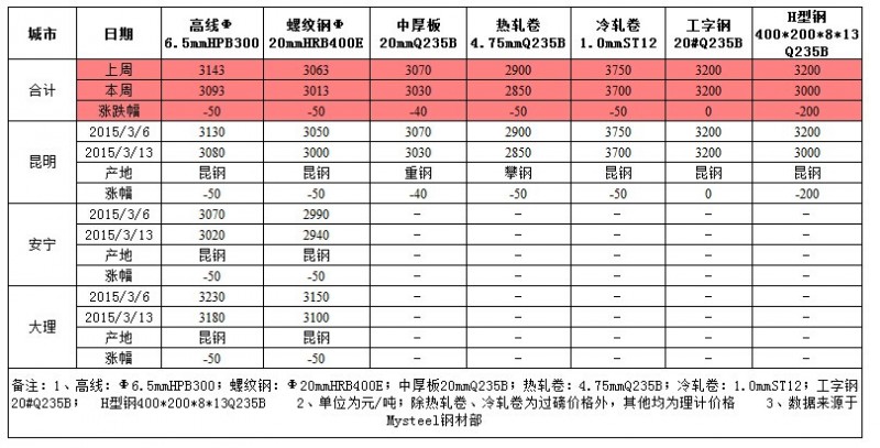表一:本周云南主要市場(chǎng)價(jià)格變化匯總(單位:元/噸)