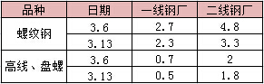 四川省鋼廠建材可銷售總庫存為7.9萬噸,較3月6日減少了2.3萬噸。其中螺紋鋼可銷售總庫存截止到目前為止為5.6萬噸,較上周螺紋鋼總庫存對比減少了1.9萬噸。而通過分析看出,目前一線、二線鋼廠庫存量總體均小幅減少。高線、盤螺可銷售總庫存截止到目前為止為2.3萬噸,與上周高線、盤螺總庫存相比小幅減少。大廠高線、盤螺生產(chǎn)持續(xù)不飽和,二線鋼廠生產(chǎn)正常,相對來說近期盤螺資源庫存占比依然較高。