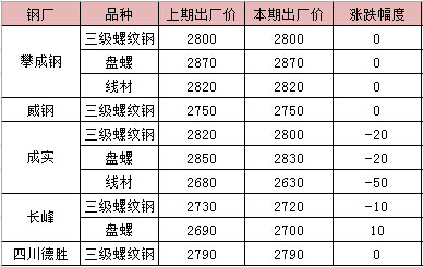 本周四川本地鋼廠中成實對其螺紋鋼下調(diào)20元/噸,線材下調(diào)50元/噸;長峰對其螺紋下調(diào)10元/噸,盤螺上調(diào)10元/噸,其余鋼廠無調(diào)價。