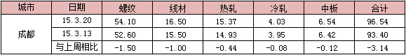 本周成都市場主要品種庫存:建筑鋼材庫存小幅下跌,目前四川市場省外線材出貨較快,但漢鋼資源不斷入庫;螺紋庫存積壓太大,加上需求不配套,銷售存在阻力。板材庫存小幅回落:本周攀鋼資源到貨量稍有放緩,再部分商家以價換量積極銷售,所以庫存出現(xiàn)了一定回落;中板方面,鋼廠資源到貨略有放緩,市場需求開始啟動,盡管成交未明顯放量,但中板庫存出現(xiàn)了小幅下降。目前,成都市場建材總庫存量為70.6萬噸,較上周增加了0.3萬噸,其中螺紋鋼約為54.10萬噸,較上周統(tǒng)計減少了0.1萬噸,線材約為16.50萬噸,較上周統(tǒng)計減少了0.2萬噸,熱軋板卷庫存量為15.37萬噸,較上周減少了0.76萬噸;冷軋板卷庫存量為4.03萬噸,較上周約減少了0.18萬噸;中厚板庫存量約在6.54萬噸,較上周減少了0.44萬噸。