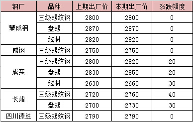 本周四川本地鋼廠中成實對其螺紋鋼上調(diào)20元/噸,線材上調(diào)30元/噸;長峰對其螺紋下調(diào)40元/噸,盤螺上調(diào)30元/噸,其余鋼廠無調(diào)價。