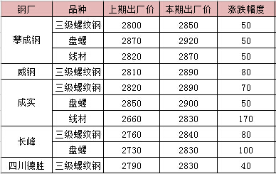 本周四川本地鋼廠中攀成鋼對其所有產(chǎn)品上調50元/噸;威鋼對其螺紋上調80元/噸;成實對其螺紋鋼上調70元/噸,線材上調170元/噸,盤螺上調50元/噸;長峰對其螺紋上調80元/噸,盤螺上調100元/噸;四川德勝對其螺紋上調40元/噸,其余鋼廠無調價。