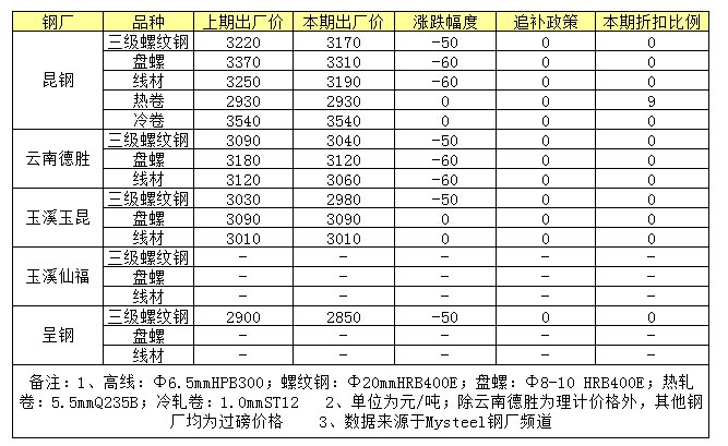 受外圍市場價格持續(xù)震蕩下行的影響,本周云南省本地建筑鋼材生產(chǎn)企業(yè)出廠價格政策均以下調(diào)為主,跌幅在50-60元/噸;而板材方面,價格暫穩(wěn)。