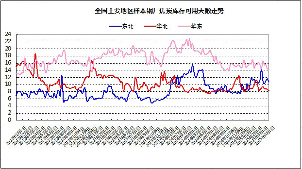 圖1:全國(guó)主要地區(qū)樣本鋼廠焦炭庫(kù)存天數(shù)走勢(shì)