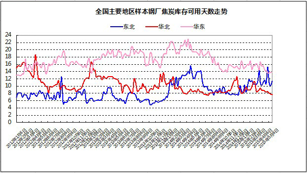 圖1:全國主要地區(qū)樣本鋼廠焦炭庫存天數(shù)走勢