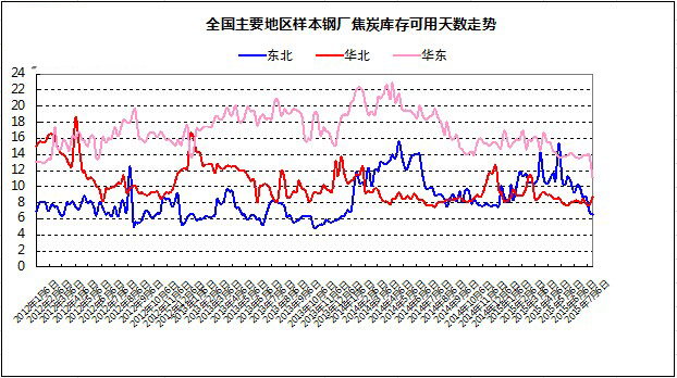 圖1:全國主要地區(qū)樣本鋼廠焦炭庫存天數(shù)走勢